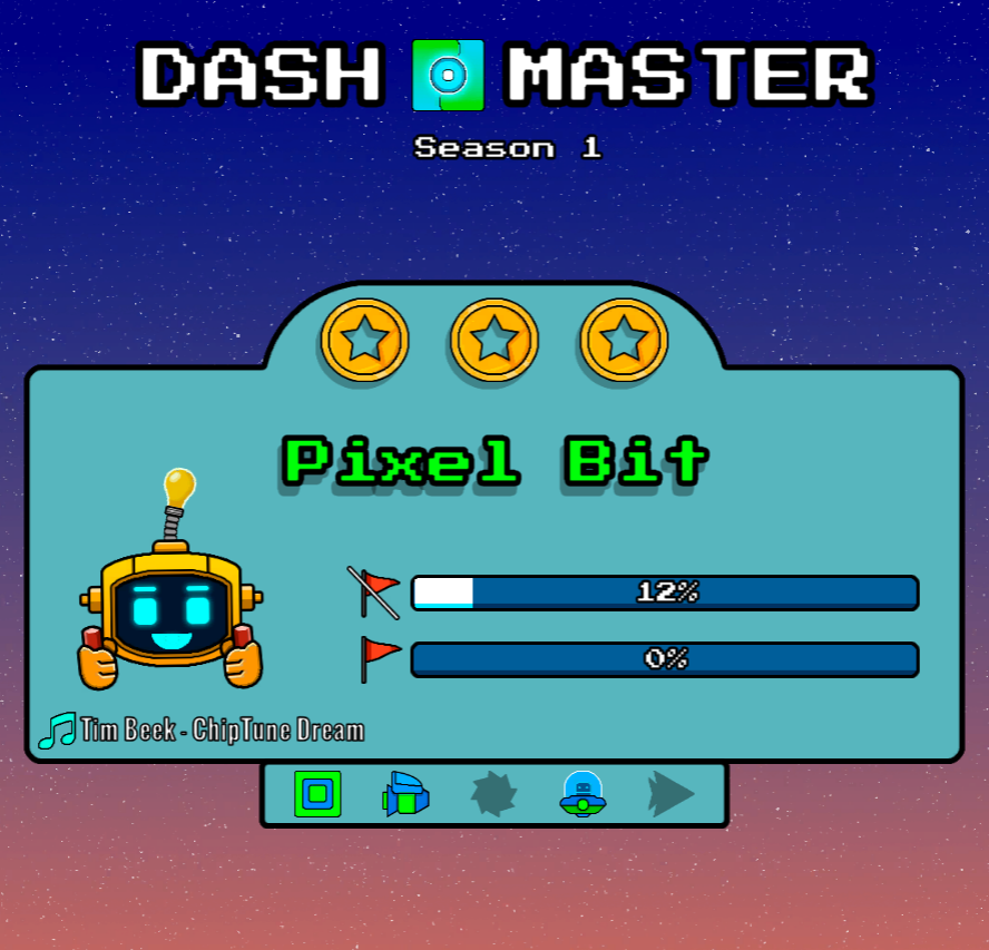 The controls in Dash Master are quite intuitive and simple. When entering the game, your block will dash directly forward. In front of you there may be sharp spike barriers, square blocks, or any other object. If you accidentally move and jump into the spike barrier, you will lose immediately. If you pass over flat surfaces, you will continue your journey. You need to click the mouse or press the up key to make the character jump. At the same time, it will rely on a physics effect that gives it bounce. You must time your jump perfectly so they do not bounce into the sharp spikes and lose the game.